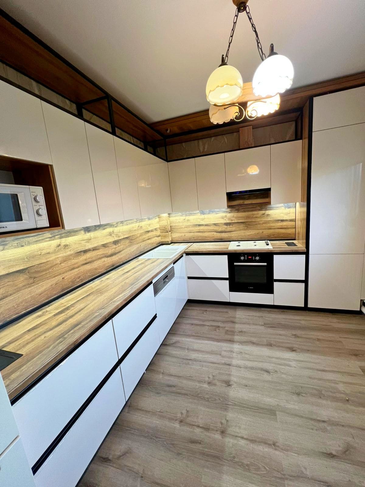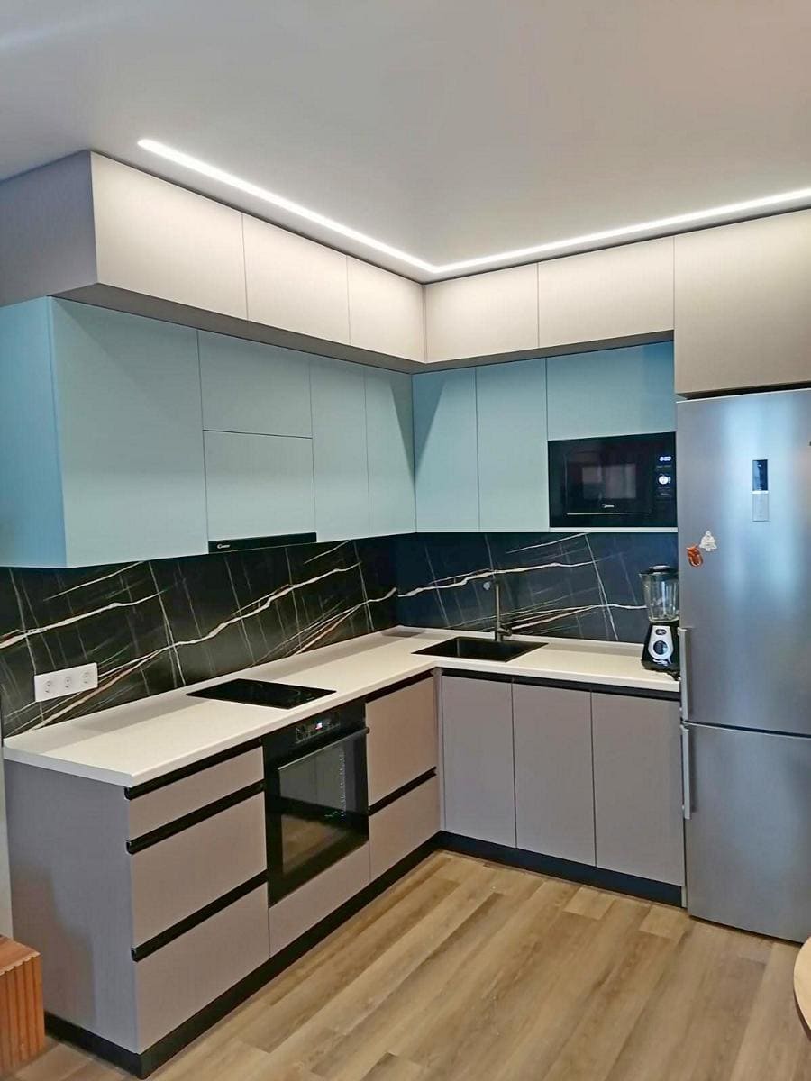 фартук в цвет столешницы, пластиковые плинтус и цоколь, ручки фирмы Trodos,